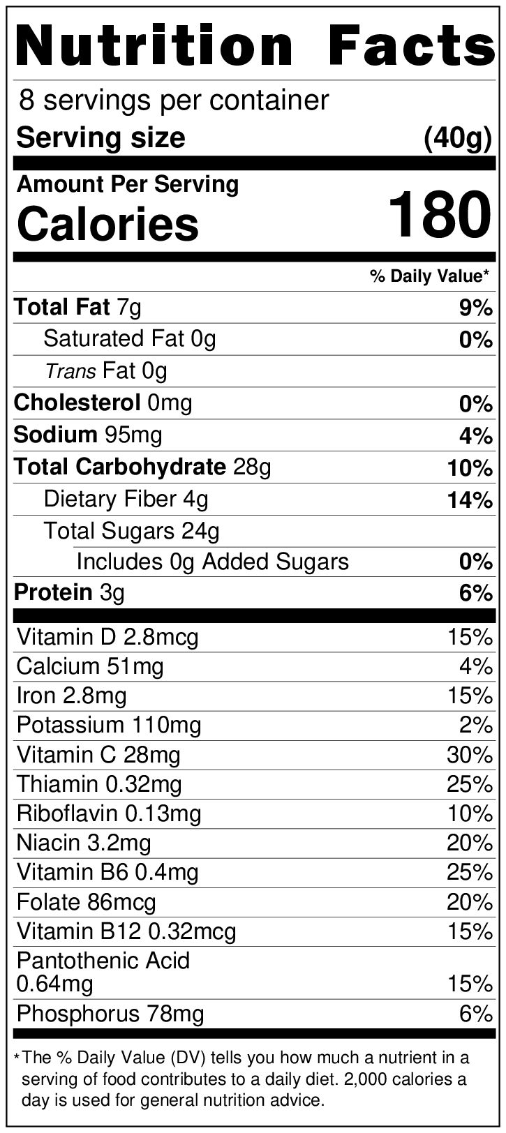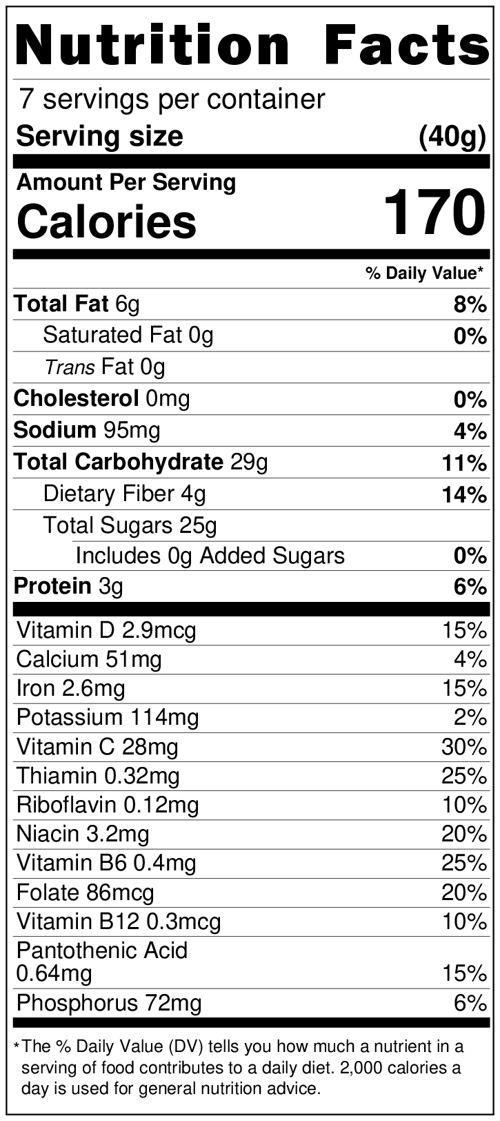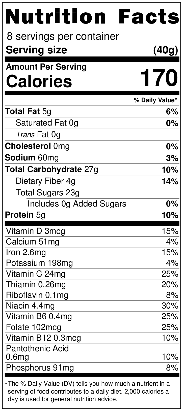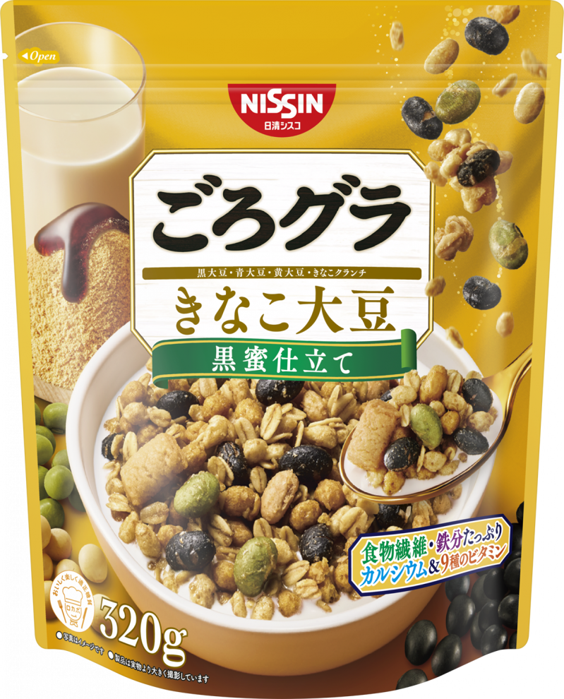 With a fragrant roasted black sugar and kinako (roasted soybean flour) flavor, this crunchy cereal brings out the deliciousness of its ingredients. Enhanced with black soybeans, green soybeans, yellow soybeans, and crunchy kinako clusters. Packed with dietary fiber, iron, one-third of the daily requirement of calcium, and nine essential vitamins.