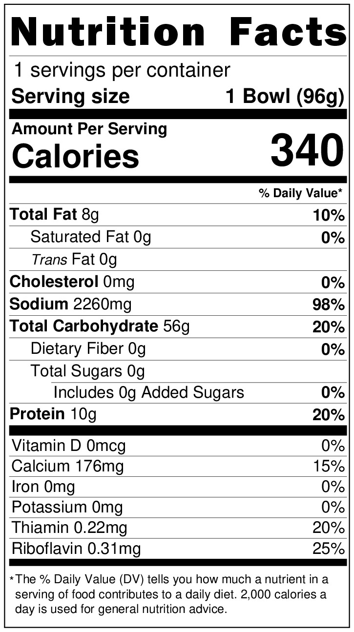 Soup: miso, protein hydrolyzate, vegetable oil, pork extract, sugars, lard, spices, salt