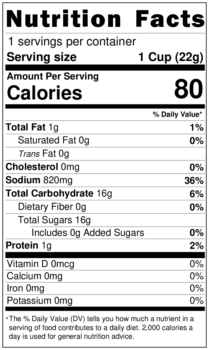 Additives: Seasonings (amino acids, etc.), caramel color, flavoring, acidulant, carotenoid color, fine silicon dioxide, antioxidant (vitamin E), spice extract