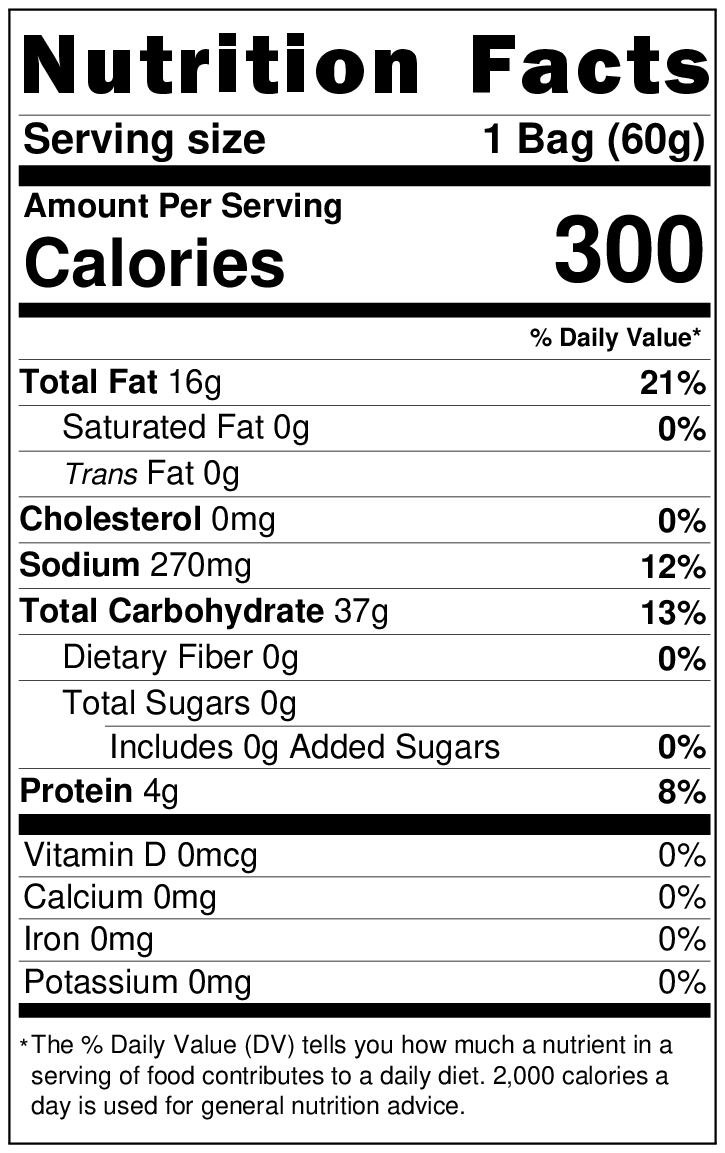 Potato (not genetically modified), Vegetable Oil, Salt, Cornstarch, Kelp Extract Powder/Seasoning (amino acids, etc.), Antioxidant (vitamin C)